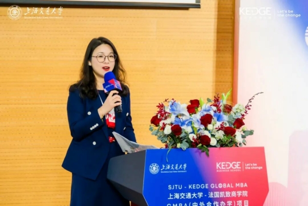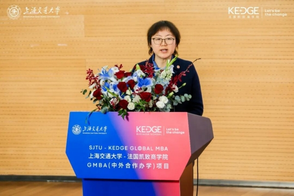 上海交通大学国际交流处副处长谢玮在致辞中向毕业生和新生表示祝贺与欢迎,她指出,中外合作办学是上海交通大学的优秀传统,打造了一批富有成效的示范性合作项目,其中与法国凯致商学院的MBA合作,已成为中法高等教育合作的标杆。面向未来,她表示,学校将持续深化与法国凯致商学院的合作,优化课程体系,拓展学生国际视野,着力培养具有全球竞争力的管理人才。最后,她再次祝贺新生开启求学之旅、毕业生迈向人生新阶段,勉励大家勇敢追梦、坚定前行,创造属于自己的辉煌。