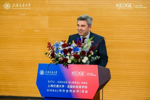 法国驻上海总领事王度(Joan VALADOU)以流利的中文发表致辞。他向47位毕业生与46位新生致以祝贺,回顾了上海交通大学与法国凯致商学院二十余年的合作历程,指出该项目作为中法高校携手创办的首个MBA项目,具有开创性意义,体现了两国在高等教育与人文交流领域的蓬勃活力。他结合近年来中法元首互动与高层互访,以及2026年即将举办的中法文化之春、法语活动月等一系列交流盛事,鼓励同学们在学业之余积极参与跨文化对话,并强调在充满不确定性的当下,开放包容的胸怀与跨文化沟通的能力尤为珍贵,这正是项目赋予学生的核心素养与前行底气。他寄语全体同学,以扎实的专业素养与双文化背景,继续做中法友谊的桥梁,为两国关系的深入发展注入持久动力。